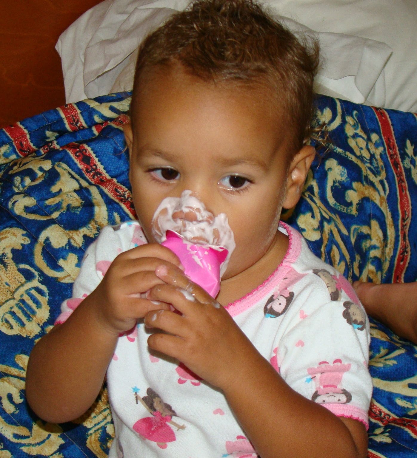 The Queen of Mess! She was eating a yogurt from a cup that you are supposed to "crush" as you eat it! :) And she had already had her bath! :)