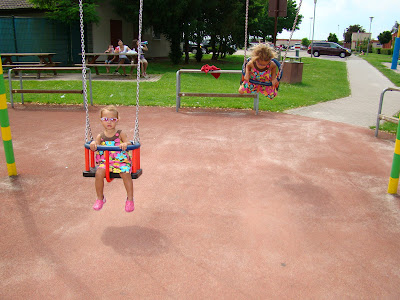 We go to this park every afternoon. Poor Kailee was still so sick in this picture (but the girls were driving me batty in the hotel room!) We went out for a bit and Kailee was so lifeless. The poor thing didn't crack a smile for 3 days!!!!!!! I think the antibiotics have finally kicked in and she has had moments of being herself...she's been so crabby and irritable, but Leevi and I know how she feels because we both have the same cold too (headache, sore throat, runny nose, cough) and Kailee got an ear infection and has had a fever on top of all that. She woke up grumpy from her nap yesterday and snapped at Hailey. Hailey said to her, "Kailee, we are sisters. We are supposed to love each other, remember?!" awwwww!